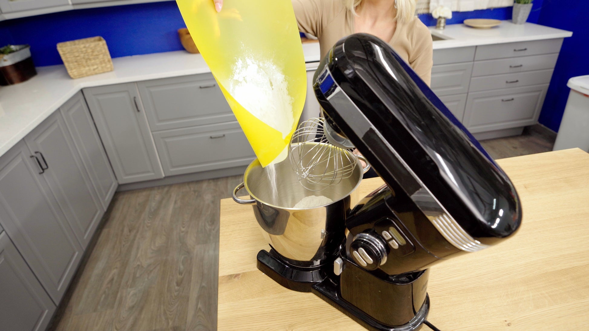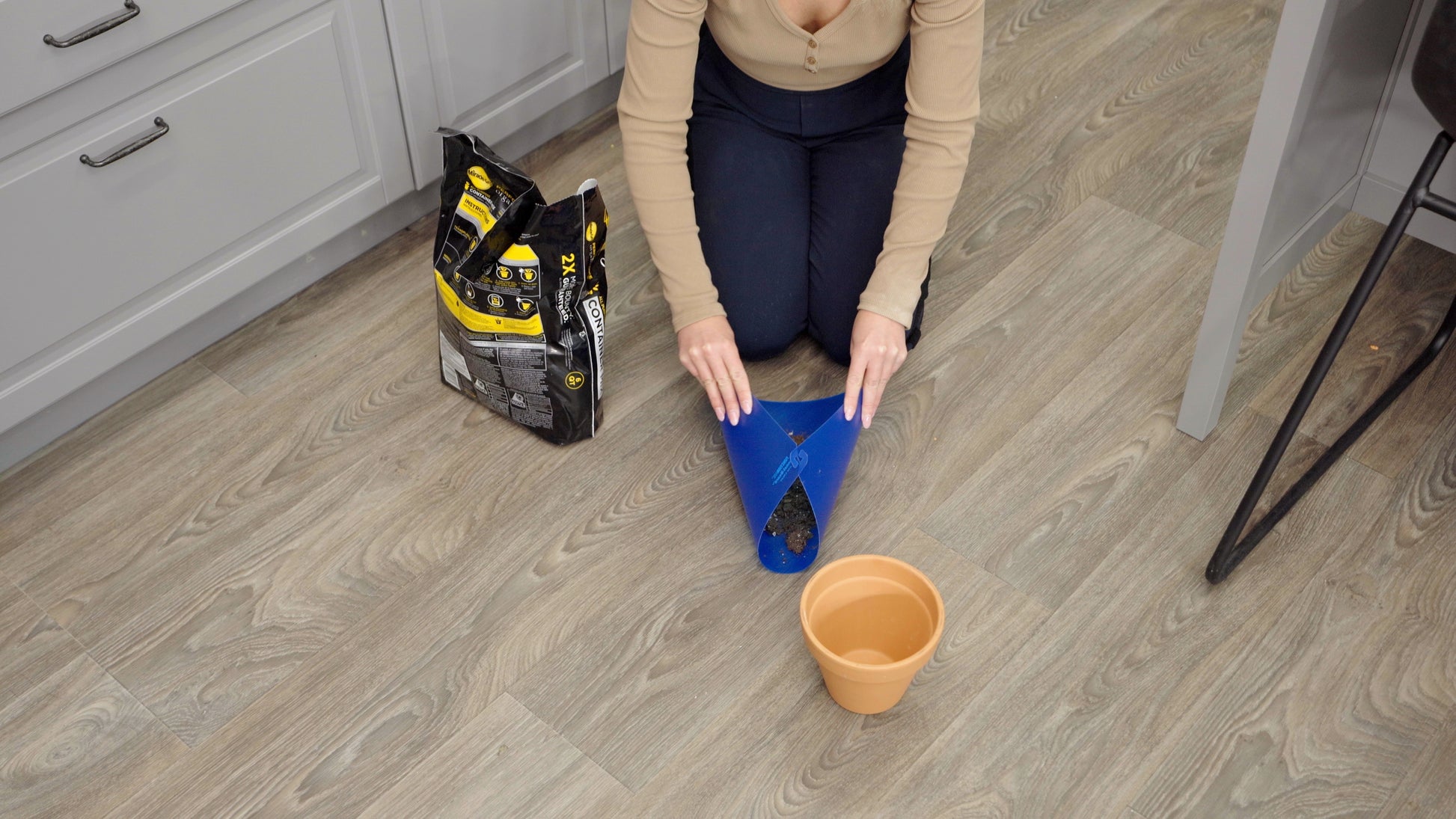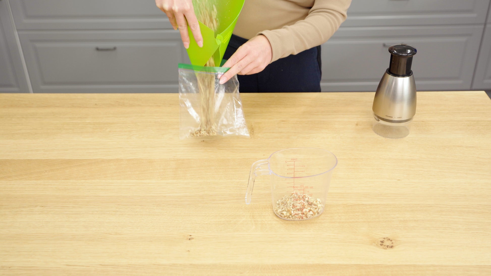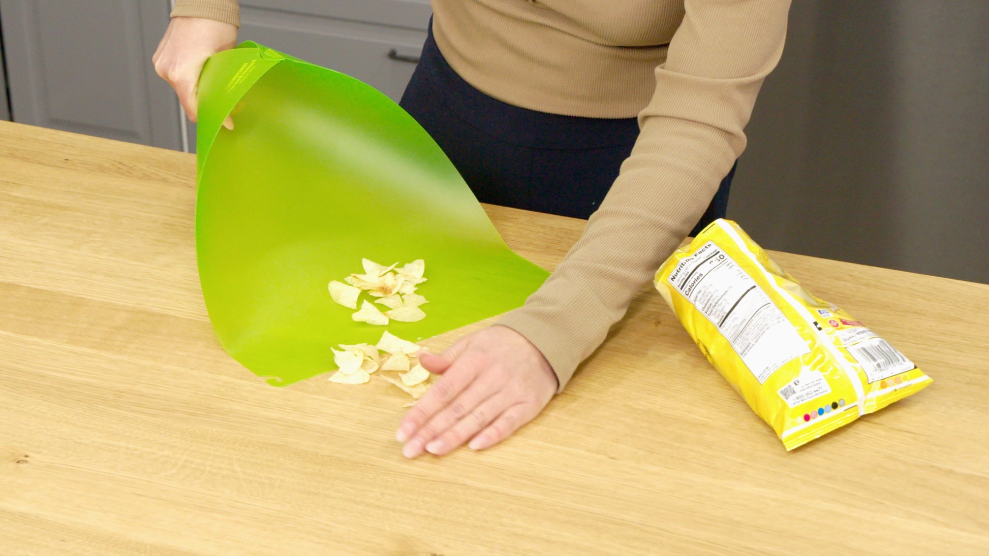 Full-fledged cutting board that folds and locks into a funnel or scoop when needed.